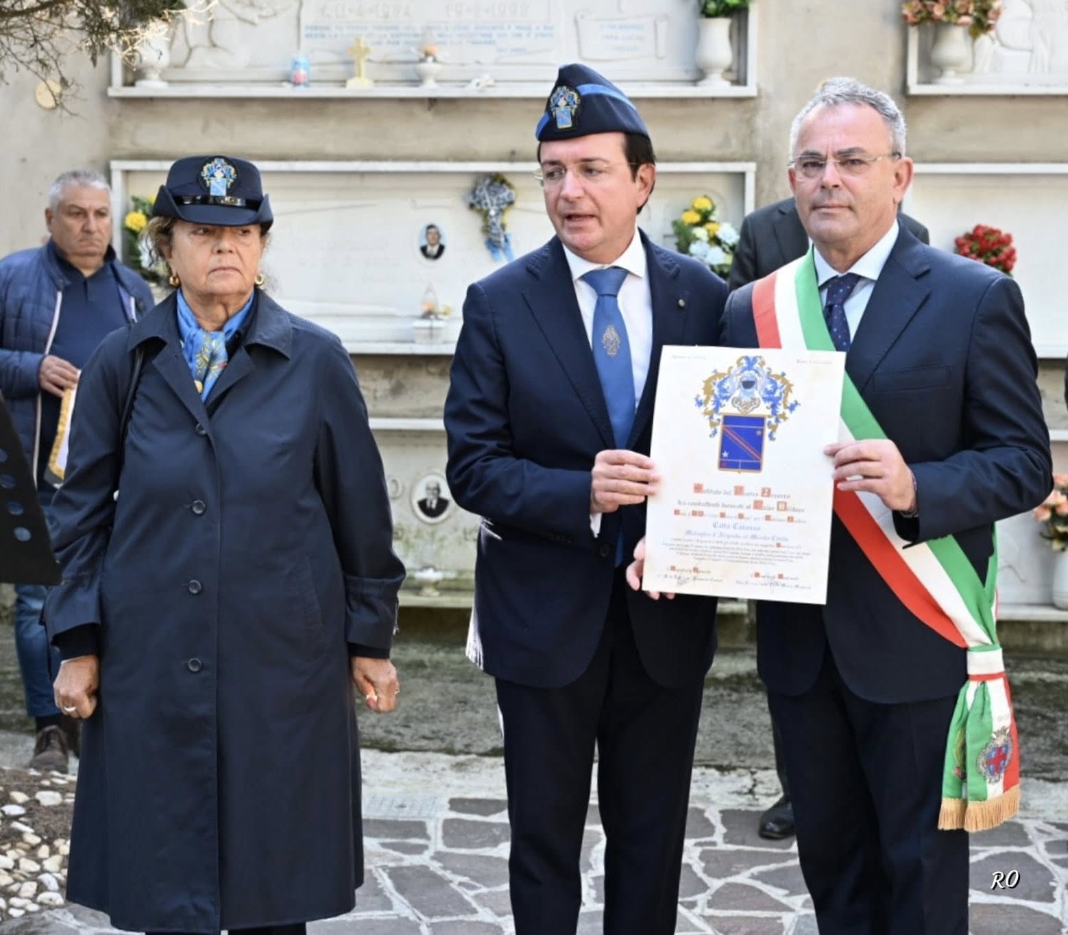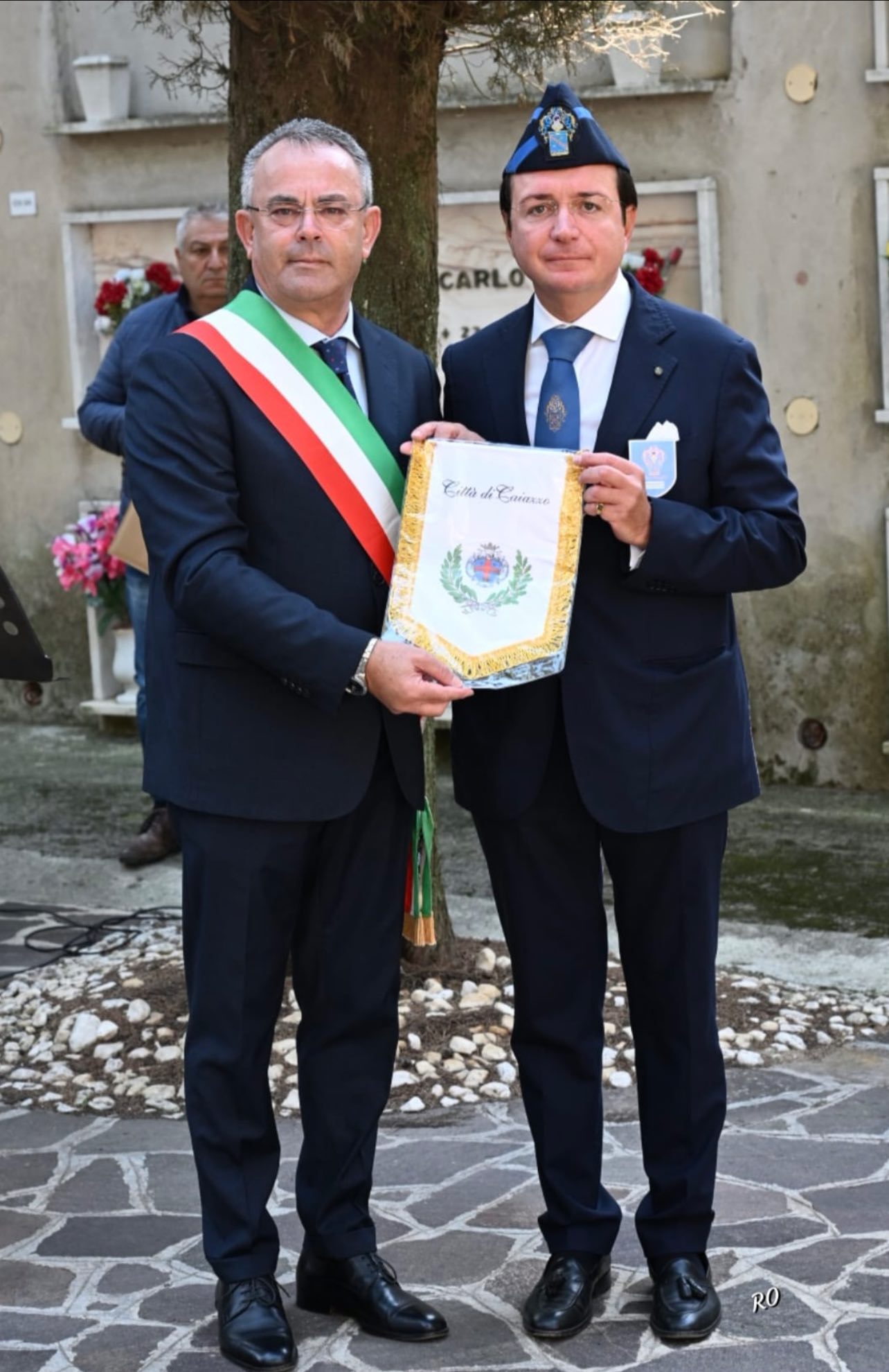 Durante la cerimonia, il Commissario straordinario per la Federazione provinciale di Caserta dell'Istituto del Nastro Azzurro, Luigi Cobianchi, ha consegnato alla Città, attraverso le mani del Sindaco, il simbolo araldico dell’Istituto del Nastro Azzurro, a testimonianza di un legame fondato sulla memoria, sul valore e sul rispetto delle radici comuni.